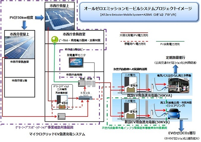 平成26年度と27年度にかけて、市庁舎の陸屋根部分に太陽光発電(以下「PV」といいます。)設備を設置して再生可能エネルギー供給源とし、この電力を二次電池に蓄電した上で、市内路線バスである「電気バスはむらん」用の既設EV用急速充電器、一般電気自動車(以下「EV」といいます。)用の急速充電器及び市庁舎にPV電力を供給するシステムを構築しました。