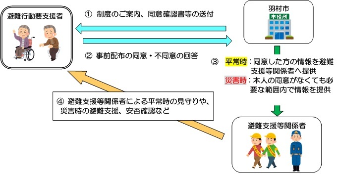 また、同意いただけなかった方については、平常時の声掛けや情報提供等はしませんが、災害時には、災害対策基本法に基づき、同意の有無に関わらず、名簿の情報を避難支援等関係者へ提供させていただきます。