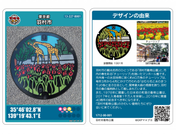 第6弾となるマンホールカードは「羽村市動物公園とチューリップ」をデザインしたものです。このマンホール蓋はヒノトントンZOO(羽村市動物公園)内にありますが、入園料が別途必要となります。また、S&Dスポーツアリーナ羽村(スポーツセンター)前の新奥多摩街道の歩道にもあります。