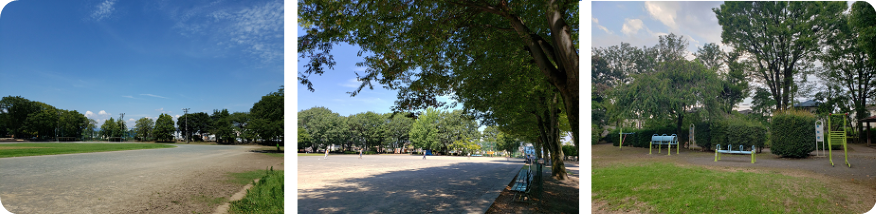 (下左)陸上競技場(ソフトボール場) (下中央)多目的広場 (下右)健康遊具