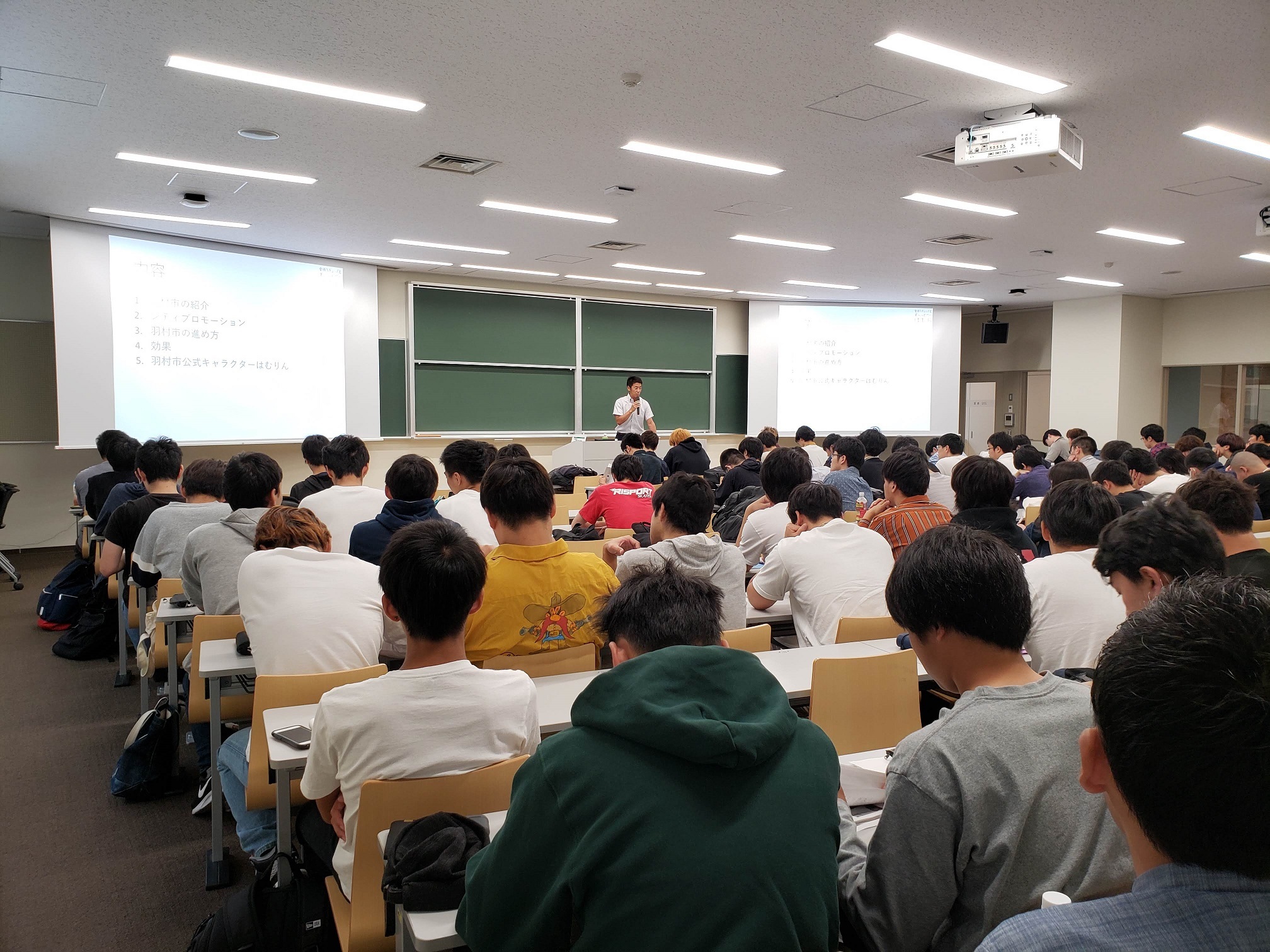 関東学院大学法学部(地域創生学科 牧瀬稔 准教授)から、「地域協働論」に関連したシティプロモーション事業について講義の依頼を受け、令和元年10月7日(月曜日)に、「オールはむら」で進める羽村市のシティプロモーションについて178人の学生に講義を行いました。
