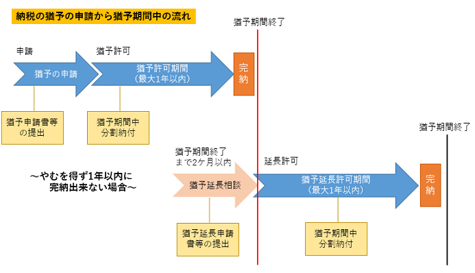 (ご注意)やむを得ない理由があるときは、猶予期間を1年以内の必要な期間について延長できる場合があります。(最初に猶予を受けた期間から通算して最長2年まで)
