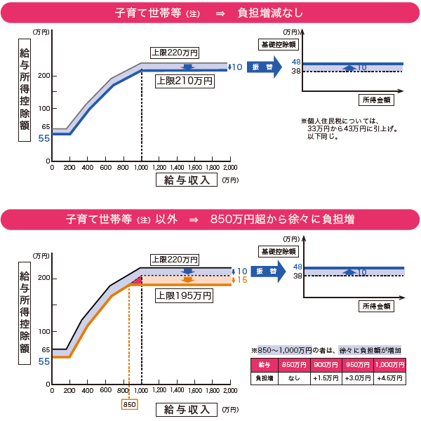 給与所得控除について、給与収入が850万円超の場合の給与所得控除額の上限が195万円に引き下げられました。給与収入850万円超の納税義務者は増税となるため、給与収入850万円超の納税義務者のうち、子育てや介護を行っている者に負担増が生じないようにするために措置されました。