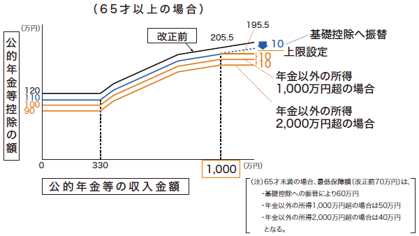 ・公的年金等の収入以外の所得金額が1,000万円超の場合、その所得額に応じて公的年金等控除額が段階的に減額。