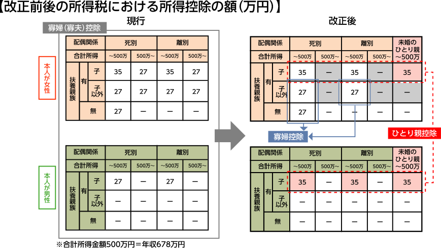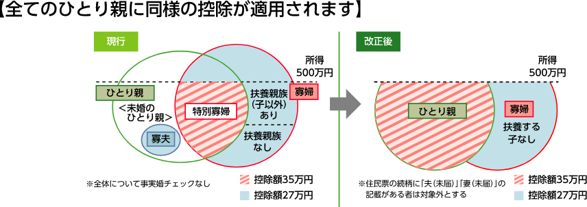 これまで、同じひとり親であっても、離婚・死別であれば寡婦(夫)控除が適用されるのに対し、未婚の場合は適用されず、婚姻歴の有無によって控除の適用が異なっていました。また、男性のひとり親と女性のひとり親で寡婦(夫)控除の額が違うなど、男女の間でも扱いが異なっていました。そこで、今回の改正では、全てのひとり親家庭に対して公平な税制支援を行う観点から以下の点が変更になります。
