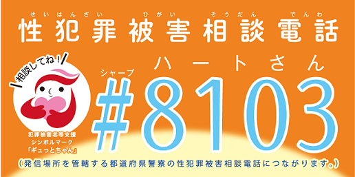 全国共通番号 #8103(ハートさん) (注意)発信場所を管轄する都道府県警察の性犯罪被害相談電話につながります。