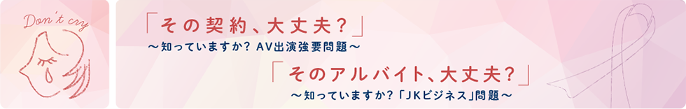 ・AV出演強要問題、JKビジネス問題について、被害事例、被害にあわないために知っておくこと、被害にあったらどうすればよいかを紹介しています。