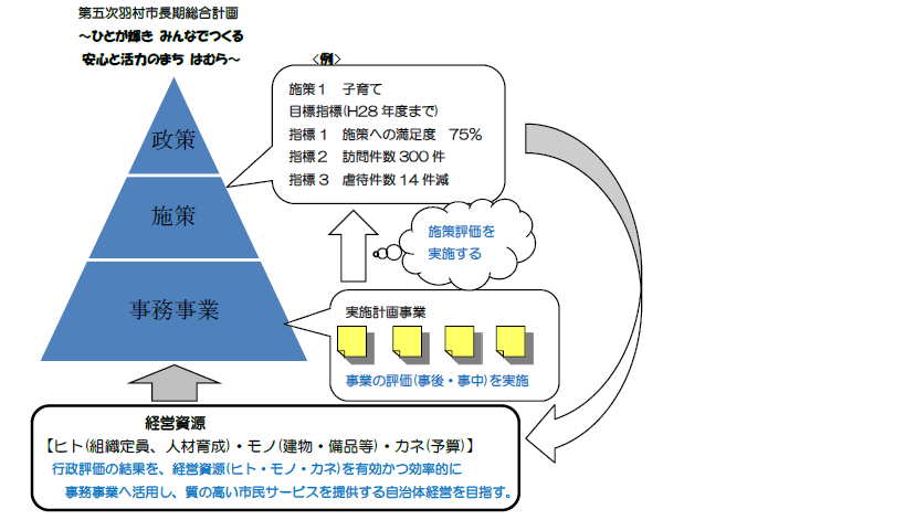 羽村市の行政評価制度は、平成27年度から制度を見直し、政策・施策・事務事業を体系化した長期総合計画に沿って、施策と実施計画に掲げた全事務事業の評価を行っています。その評価結果をもとに、経営資源(ヒト・モノ・カネ)を有効かつ効率的に事務事業へ活用する手法を取り入れています。