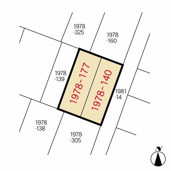 対象物件は、南西側6メートル及び南東側8メートルの供用道路(日本興業株式会社管理地)に接し、長辺28メートル、短辺24.8メートルの2筆からなる二方路、長方形の角地であって、面積は660平方メートル、当該別荘地内では標準的な広さを有しています。