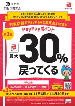 キャンペーン対象の店舗は「PayPay」アプリから確認できるほか、広報はむら11月1日号と一緒に配布されるチラシには、対象店舗の一部を掲載しています。