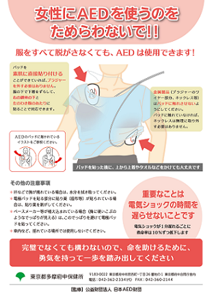 AEDは電源を入れて2枚のパッドを素肌に貼る必要がりますが、下着をずらして貼ることで、服をすべて脱がせる必要はありません。