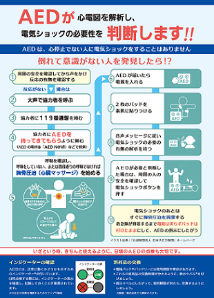 けいれんし血液を流すポンプ機能を失った状態(心室細動)になった心臓に対して、一般の方でも簡単かつ安全に除細動(電気ショック)を行い、正常なリズムに戻すことができる医療機器のことです。
