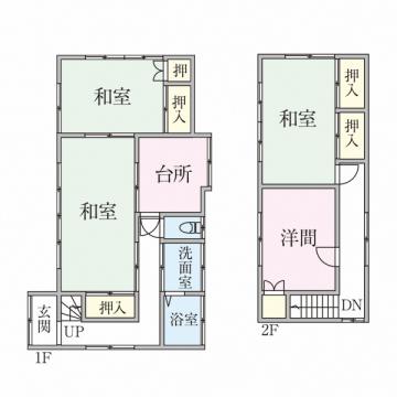 1階ダイニングキッチン約2坪、洗面約0.75坪、浴室約0.75坪、和室2間9畳・6畳