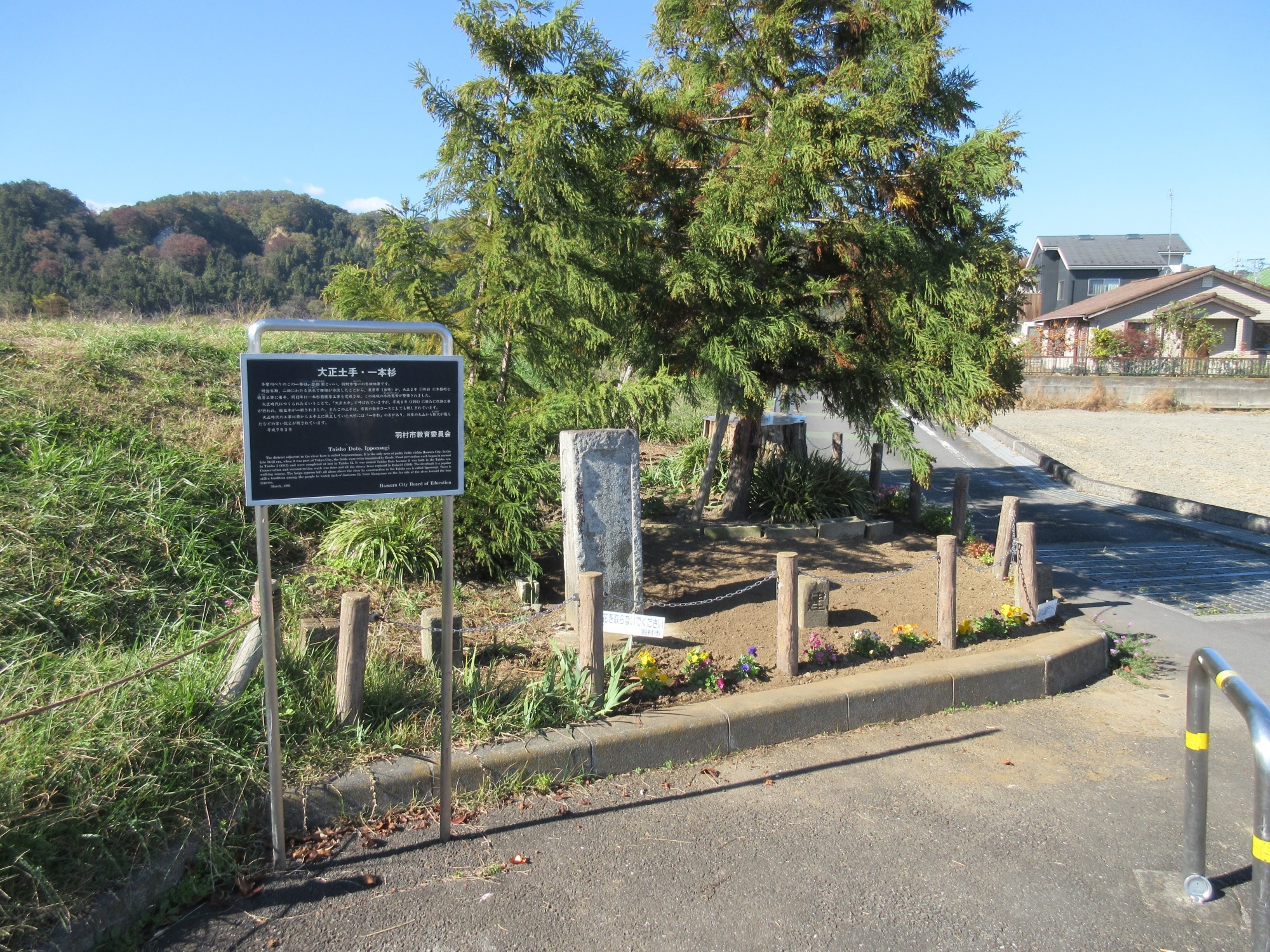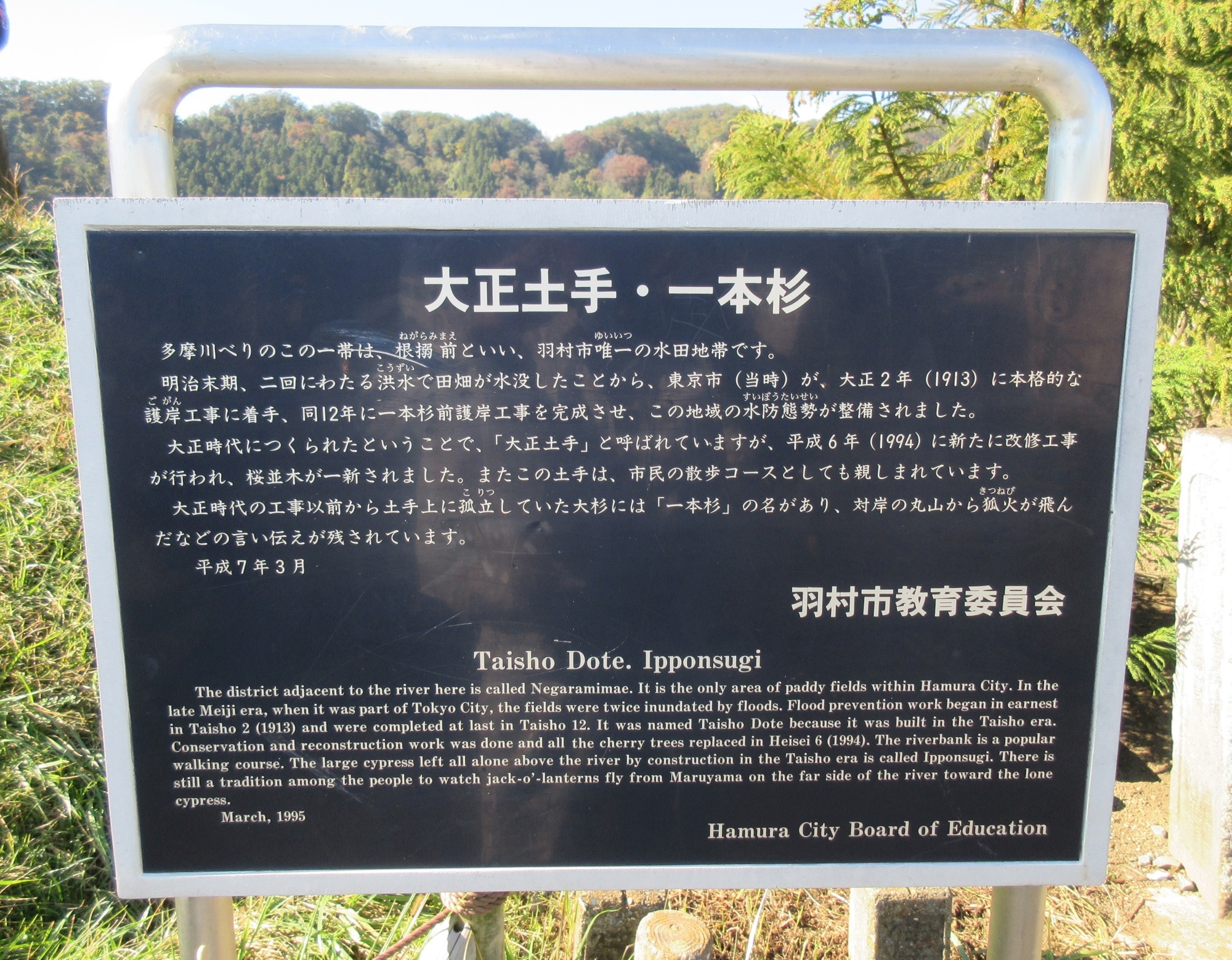 多摩川沿いにある「大正土手・一本杉」の文化財説明板。