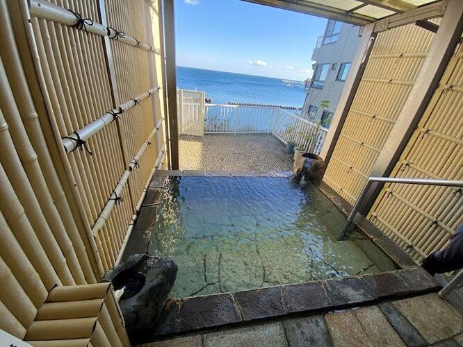 当該公売財産は建築後約57年を経過した共同利用型の温泉付きリゾートマンションの3階部分の1室です。建物前面が南東向きに建築され、北側は網代湾に面しています。建物前面には宿泊施設があって、概ね5階までは前面の宿泊施設の高さよりも低位の位置になります。