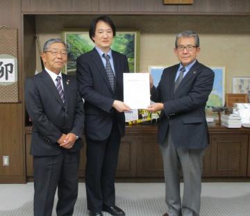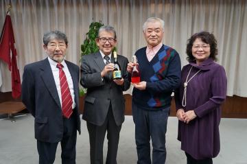 令和5年11月21日(火曜日)、地元農家の石田武尚さんと、醸造に携わった森谷尊文さん、中野多美子さんが、市内で育てたブドウで造った、はむら産のワインを持って訪れました。