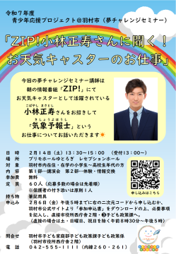 今年度の夢チャレンジセミナーは、朝の情報番組「ZIP!」にてお天気キャスターとして活躍する「小林 正寿(こばやし まさとし)」さんを講師としてお招きして「気象予報士」のお仕事についてお話いただきます。ぜひ参加してください♪