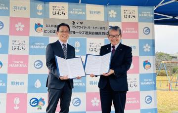 インクルーシブ遊具の設置は、「江戸街道公園ネーミングライツ・パートナー協定」において、羽村市と日都産業株式会社との間で協定を締結し、遊具などを設置いただいたものです。