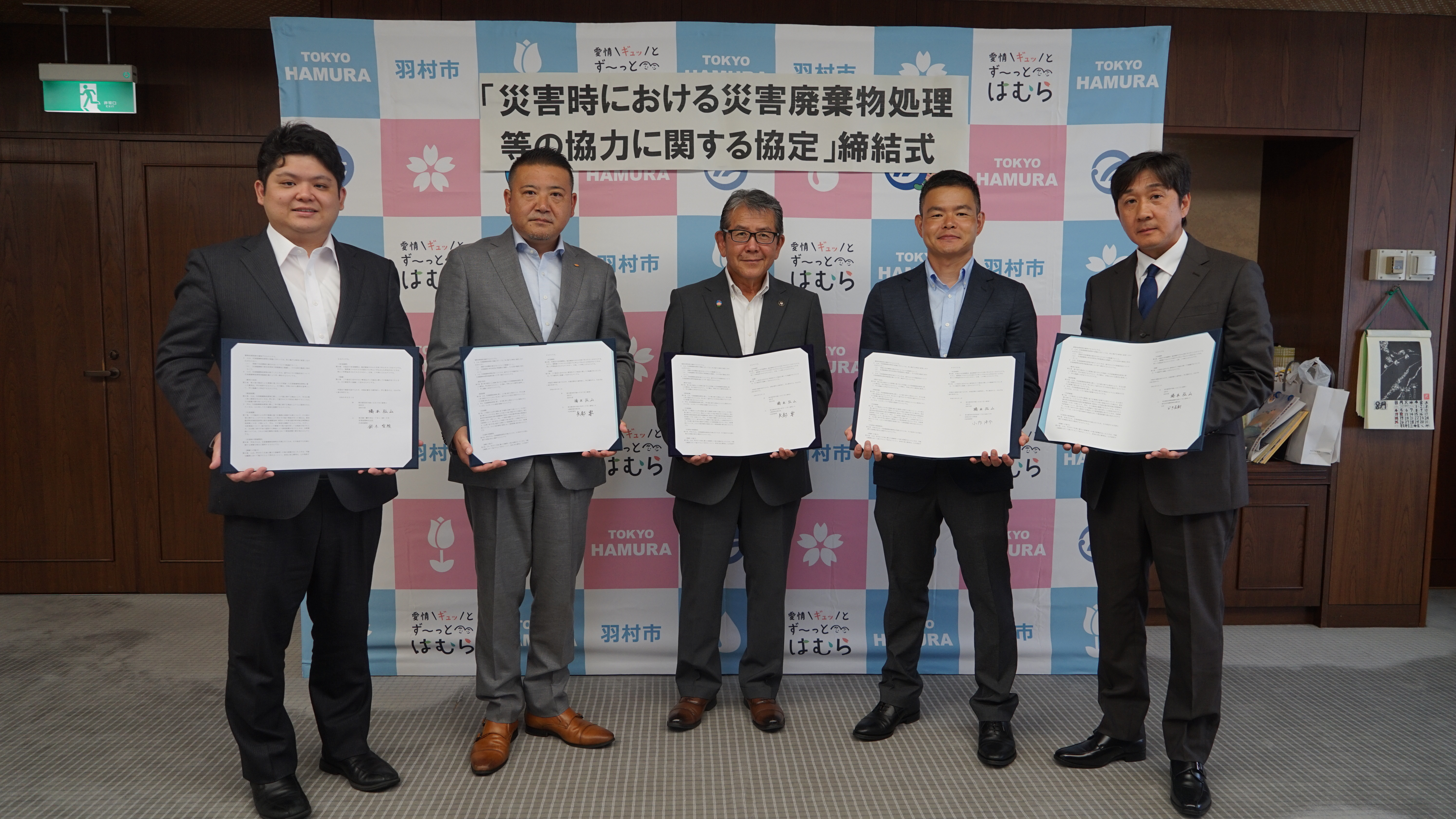 令和6年8月1日、羽村市廃棄物収集運搬委託業者である丸順商事有限会社、有限会社小作物産、栄晃産業株式会社、羽村市廃棄物中間処理委託業者である株式会社加藤商事西多摩支店の民間事業者4社と「災害時における災害廃棄物処理等の協力に関する協定」を締結しました。
