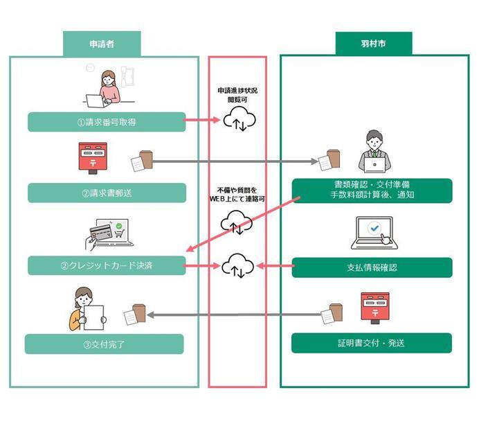 郵送請求書、本人確認書類の写し、切手付き返信用封筒、その他添付資料など請求に必要な書類一式を郵送していただき、金額が確定した旨の連絡を確認次第、証明書交付手数料の支払いをオンラインで行ってください。