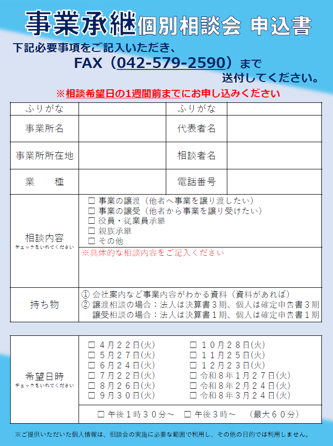事業承継に関するさまざまなお悩みにお答えする「個別相談会」を開催します。