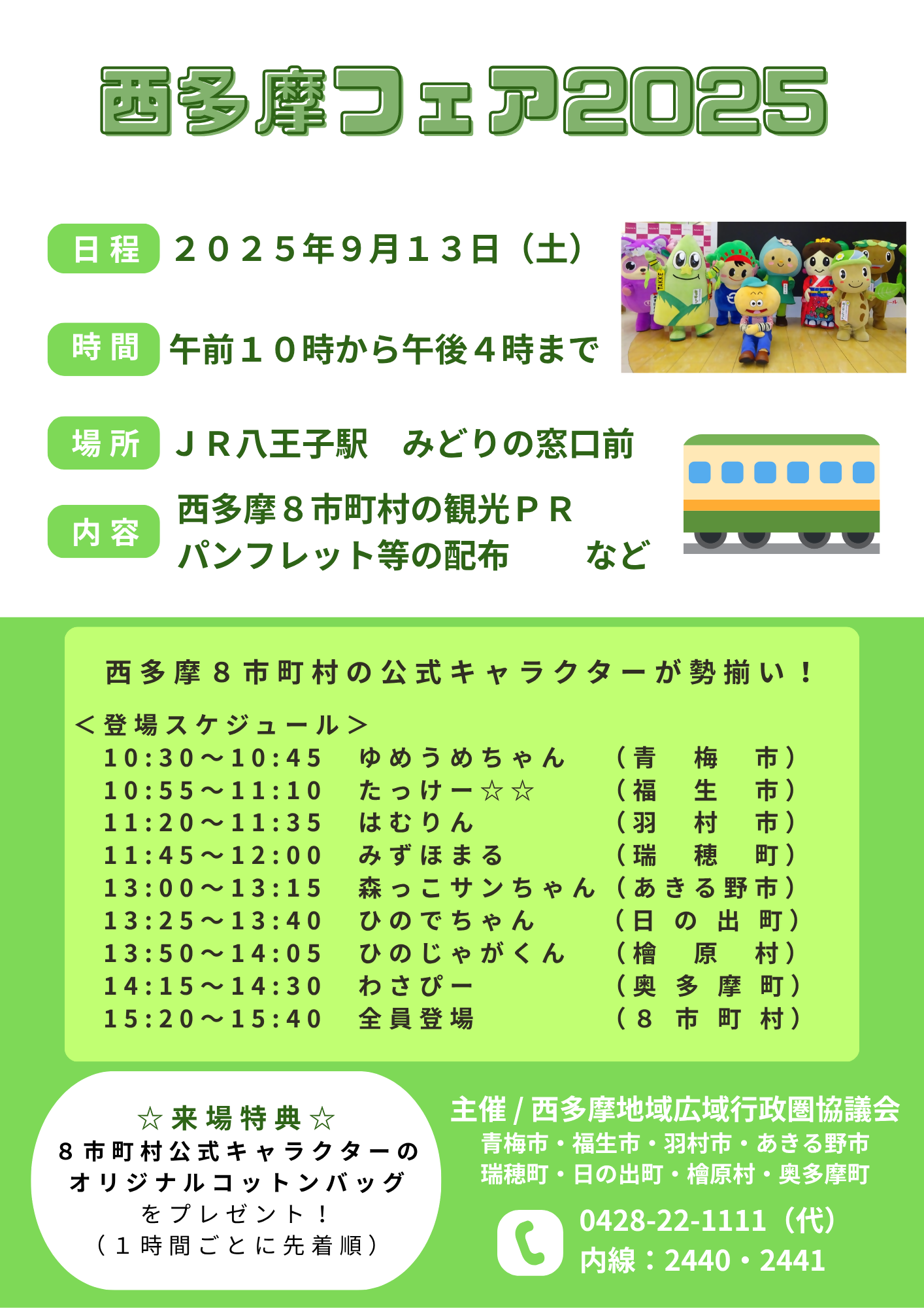 西多摩地域の8市町村(羽村市、青梅市、福生市、あきる野市、瑞穂町、日の出町、檜原村、奥多摩町)が一体となって、西多摩の魅力を発信するイベント「西多摩フェア」を開催します。