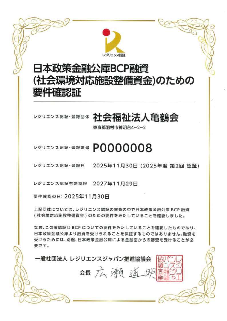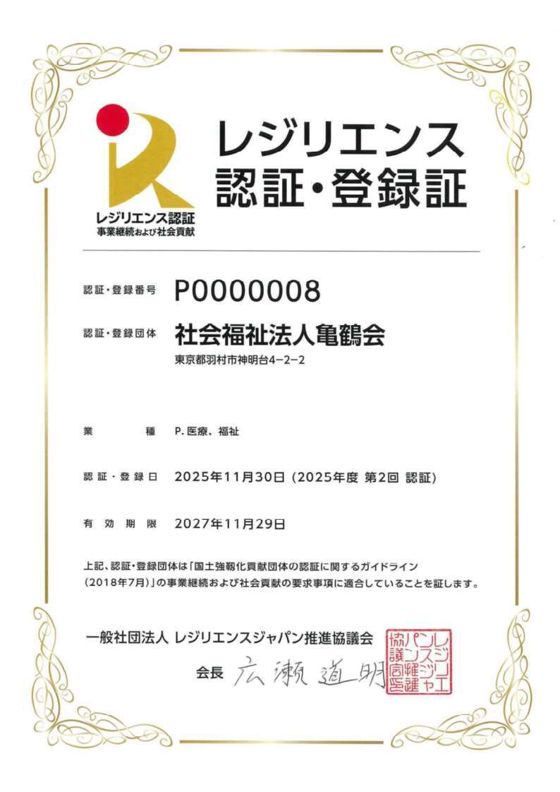 社会福祉法人亀鶴会が国土強靭化貢献団体認証(レジリエンス認証)を取得