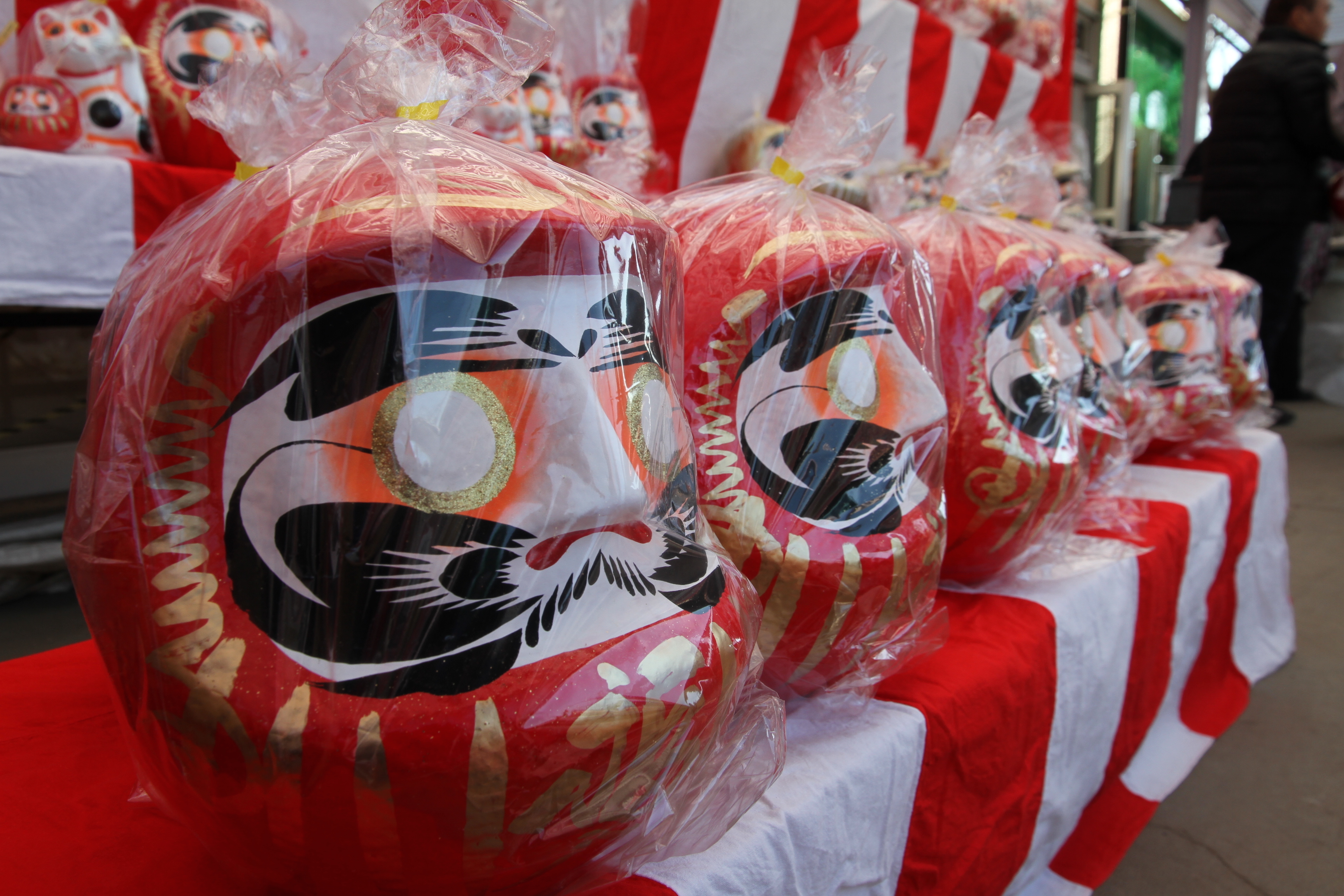 「だるま市」では、赤・白・緑・黄・ピンクなど、色とりどりの福だるまがずらりと並びます。 大きさもさまざまで、お気に入りの一体がきっと見つかるはず。