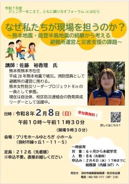 平成28年熊本地震で被災され、消防団員として避難所の運営に携わるほか、現在は熊本女性防災リーダープロジェクトRinの一員として参画されている講師からお話しいただきます。