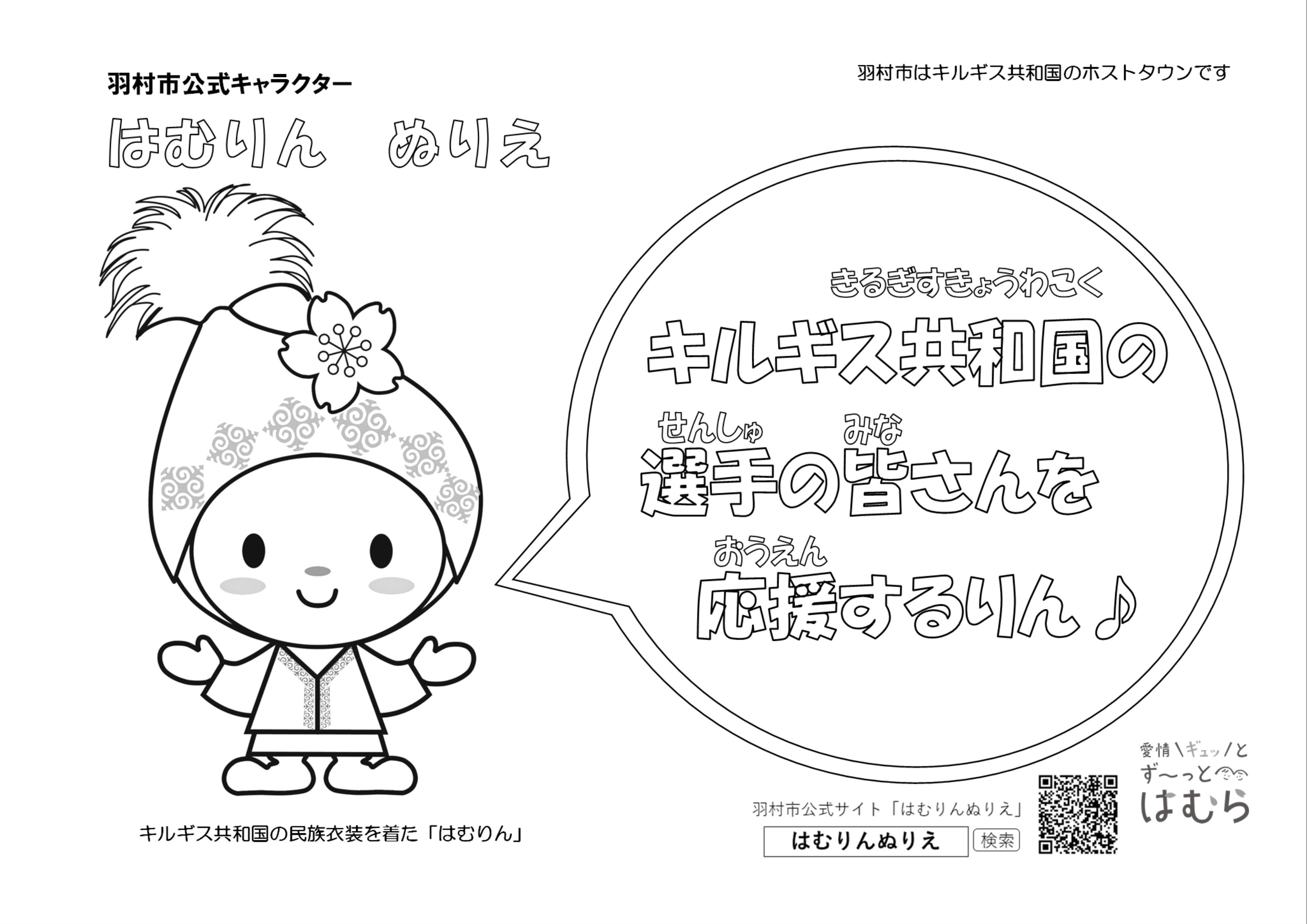 羽村市がホストタウンとなっているキルギス共和国の民族衣装を着たはむりんです。