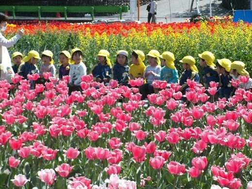 春、チューリップ畑と玉水保育園の子どもたち